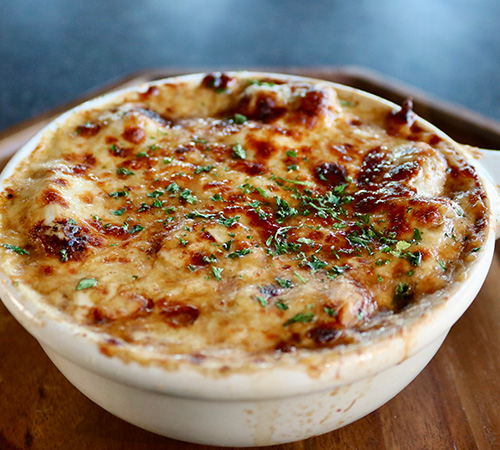 French Onion Soup – caramelized fresh onions marinated with a blend of spices, topped with garlic croutons and a blend of melted cheese. $7