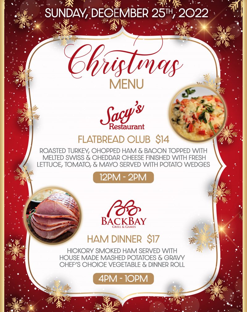 Sacy's will be open until 2pm and the Back Bay will offer a delicious Ham Dinner with all the trimmings.