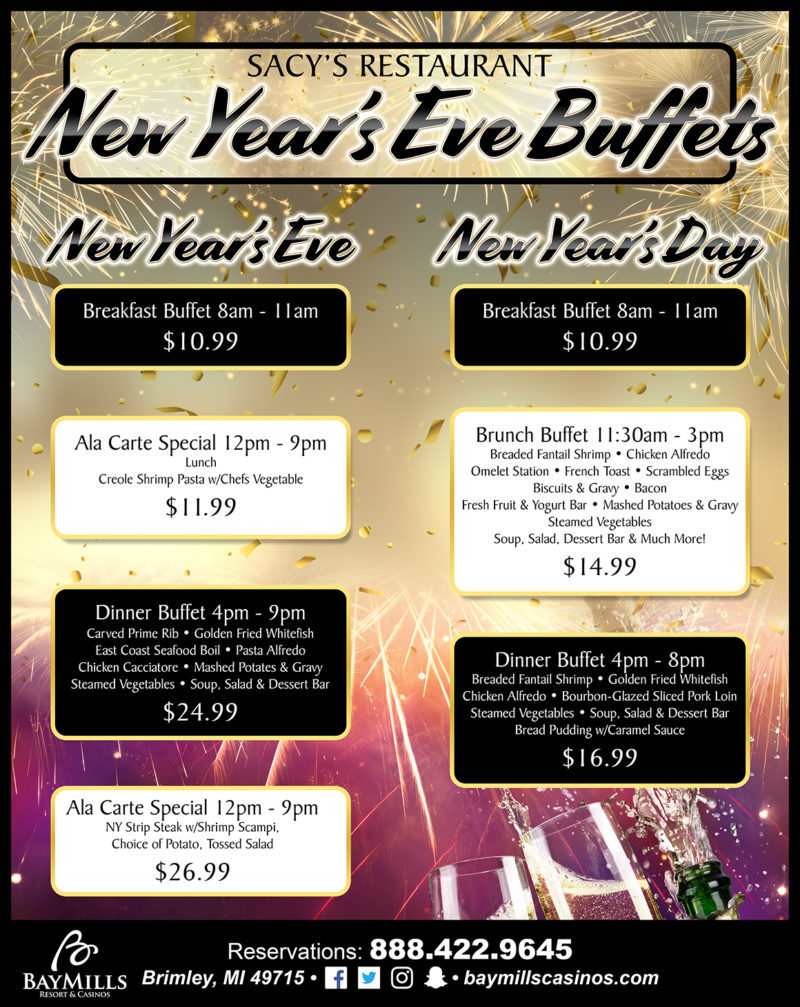 Sacy's is featuring two Ala Carte specials for New Year's Eve. If you love pasta, you'll want to try our Creole Shrimp Pasta with Chef's Vegetables for only $11.99. For you steak lovers, feast on our succulent New York Strip Steak with Shrimp Scampi, your choice of potato and tossed salad for only $26.99. Both specials are available from 12pm-9pm.